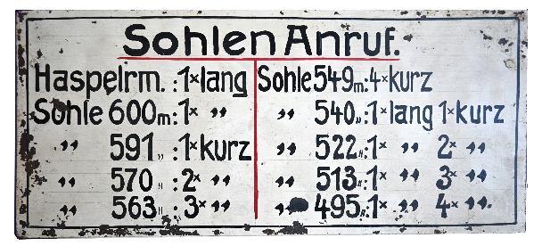 Am Seil sind Farbmarkierungen, damit der Maschinist die Stellung erkennen kann. Er fährt das Fördermittel langsam am Anschlag bündig vor. Bei Bündigstellung kommt vom Anschläger auf der 600 m Sohle 1 Schlag (halt). Der Maschinist legt die Bremse auf und die Be- und -Entladung kann durchgeführt werden.